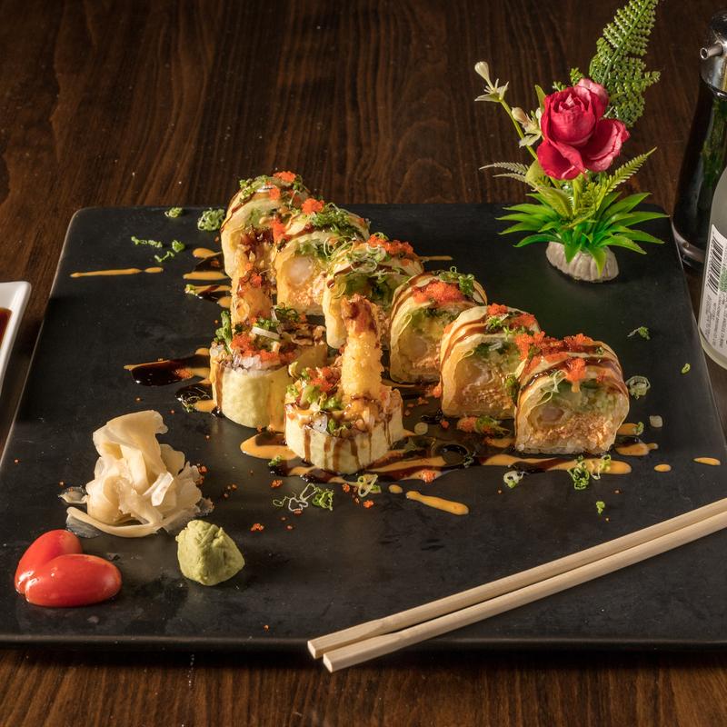 Spicy tuna, shrimp tempura, wrapped with avocado and chef’s special sauce