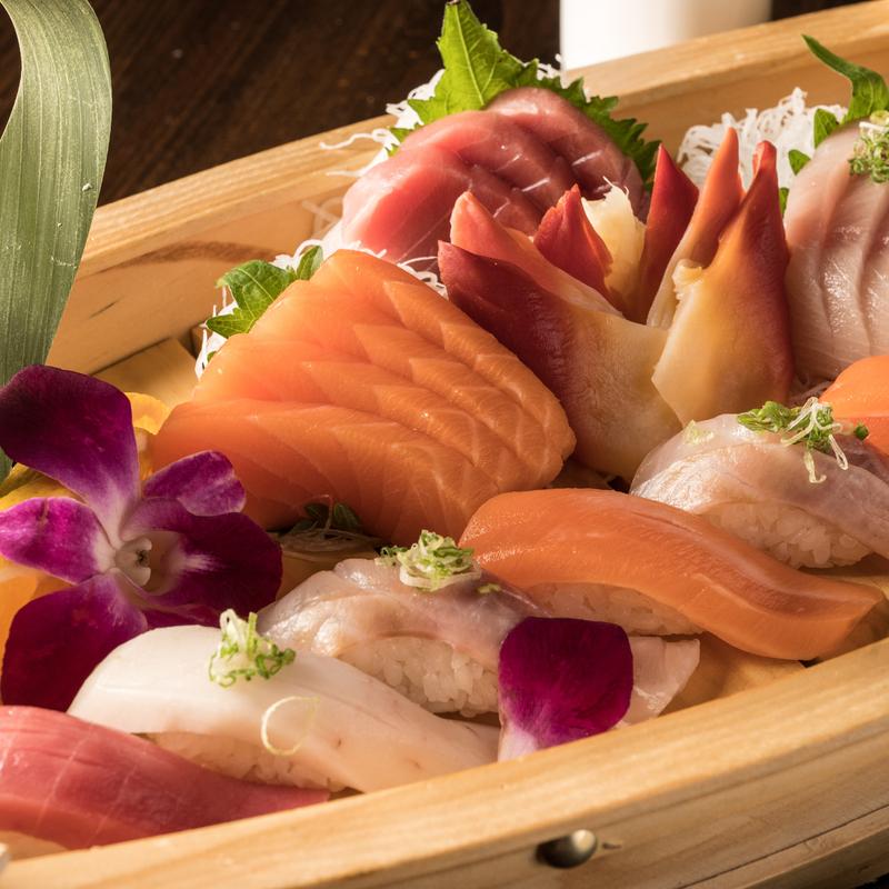 Twelve pieces sushi, twenty pieces sashimi and four special rolls: fuji naruto roll, rainbow roll, mango roll, and spider roll