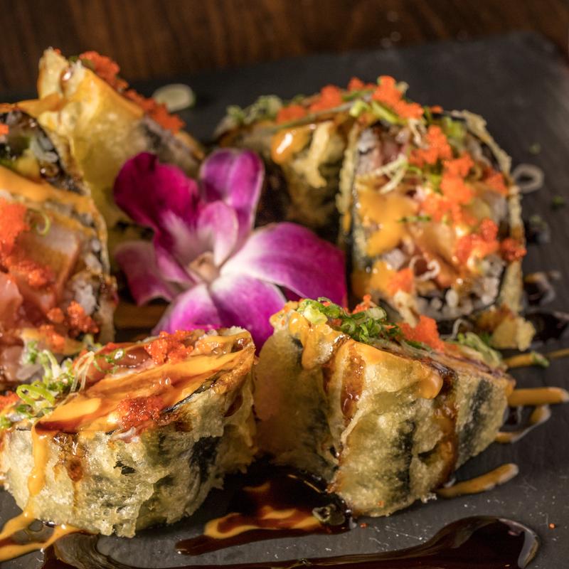 Deep-fried tuna, crab, avocado, and cream cheese topped with eel sauce, spicy mayo, chili sauce, and masago